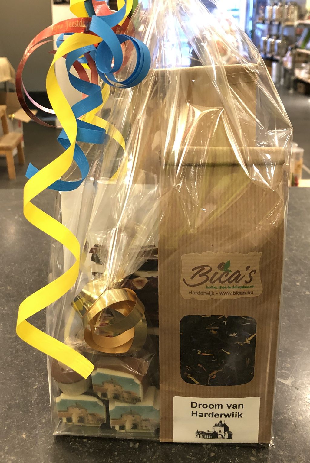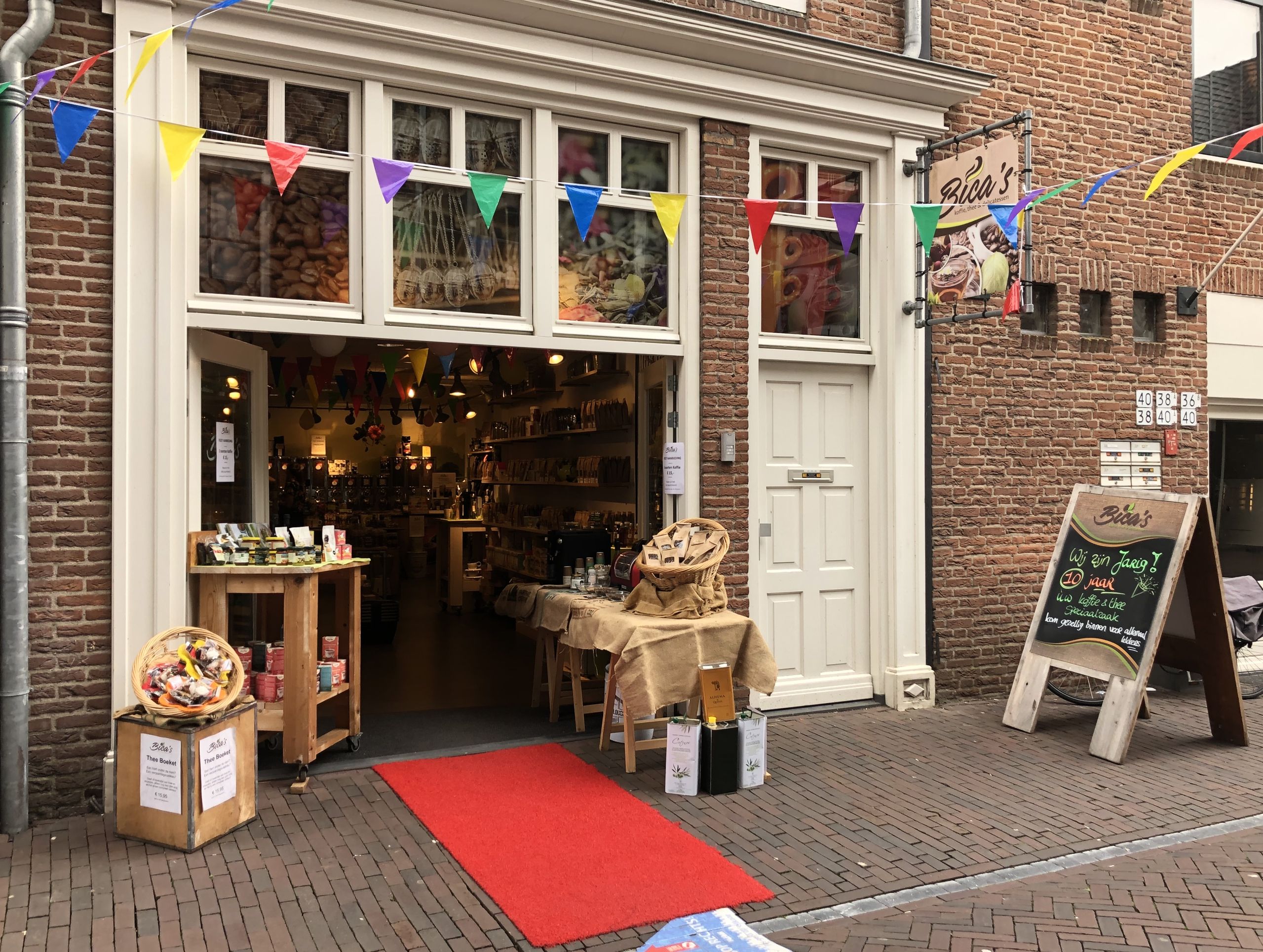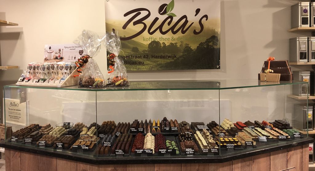 "Bica's koffie, thee en delicatessen is een speciaalzaak met zeker 23 soorten vers gebrande koffiebonen welke ook gemalen kunnen worden, zo'n 200 soorten losse thee, heerlijke handgemaakte bonbons van hoge kwaliteit, zoetwaren uit Italië en Engeland en alles wat daarbij hoort. Ook voor cadeaus slaagt u zeker bij Bica's. We adviseren met plezier. U bent van harte welkom!"