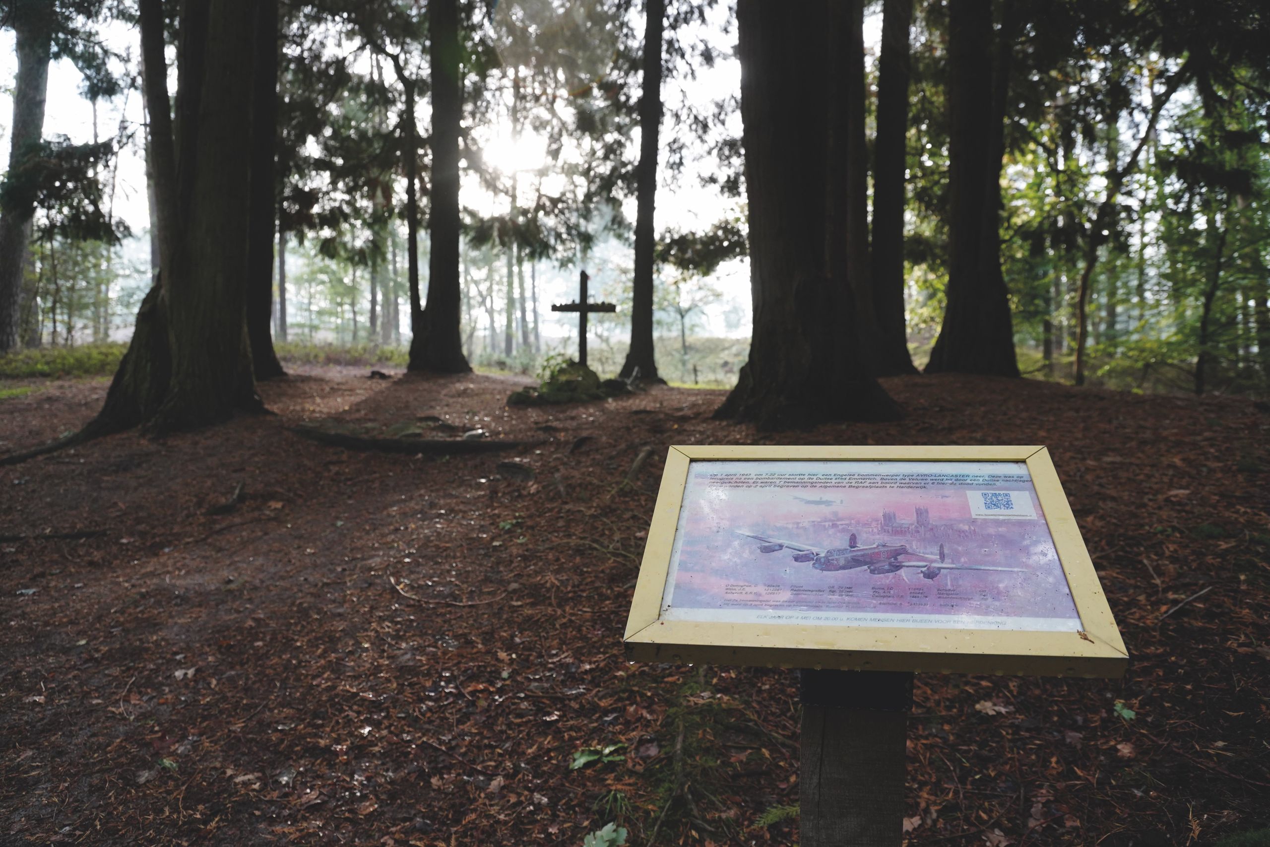 1,7 km na KP 73 staat aan de rechterkant van de zandweg een bordje Schapendrift/Hierderweg. Ca. 200 meter verder staat een paal met een herdenkingsbord. Ga hier het bospad in en na ca. 200 meter ziet u een gedenkteken. Dit herinnert aan het neerstorten van een Engelse bommenwerper, de Afro Lancaster MKIII, die op 1 april 1943 door een Duitse nachtjager werd neergehaald. Om het monument staan 7 coniferen, voor elk bemanningslid één.