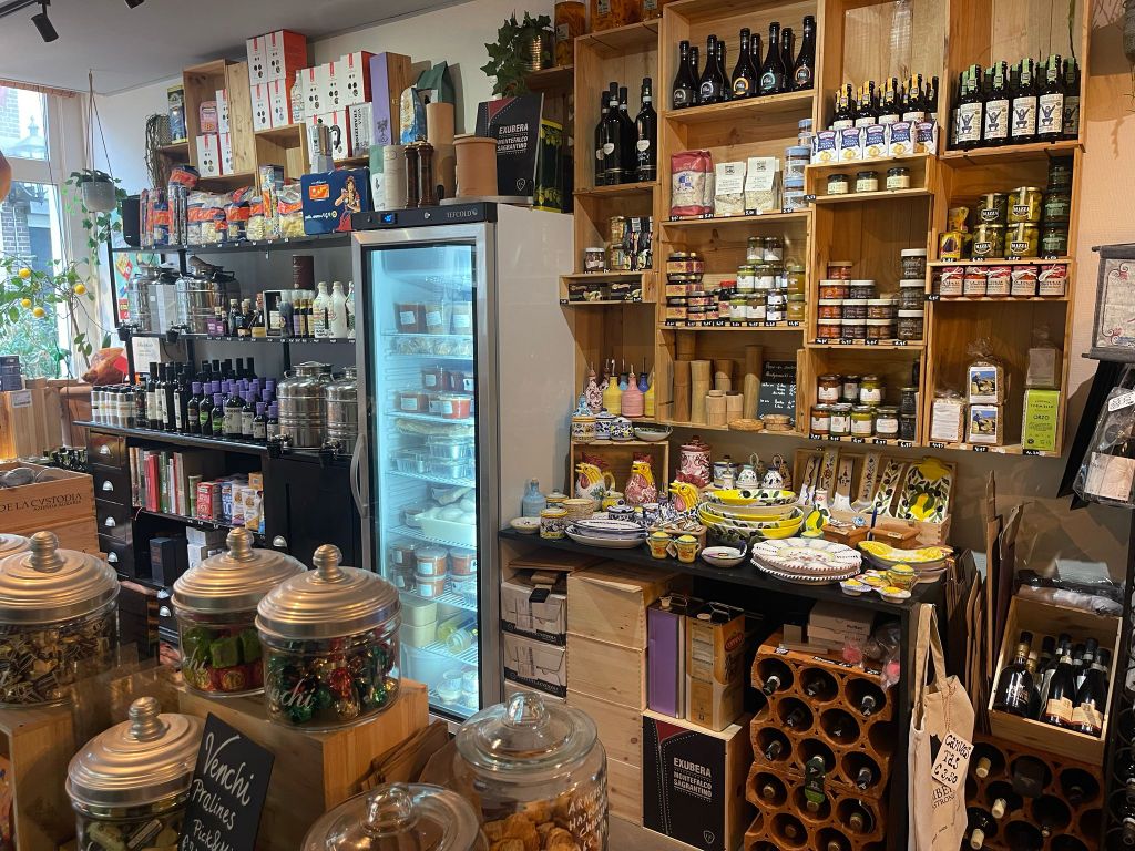Naast de versproducten staat de kastenwand vol met delicatessen uit alle windstreken van Italië. Ook diverse verse sauzen, pizzabollen en antipasti zijn hier te vinden.